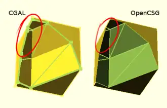 The OpenCSG library is used for generating the preview image of the model. It uses the OpenGL Z buffer to rapidly evaluate the appearance of objects without having to generate polygonal geometry. For example, when rendering a spherical dent in a cube, it first renders the cube on the graphics card, and then limits the rendering of the sphere to only those parts visible.