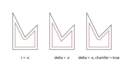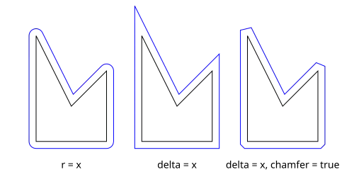 offset(c)is equivalent tooffset(r=c). - delta specifies the distance of the new outline from the original outline, and therefore reproduces angled corners. No inward perimeter is generated in places where the perimeter would cross itself.