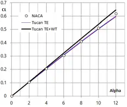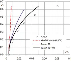 For the drag coefficient XFoil has been used to obtain the airfoil skin friction component at a Reynolds number of 4.000.000 to match the wind tunnel test conditions. The XFoil prediction at zero lift accounts for the total drag at zero incidence angle, and it is impressively accurate. As the incidence increases, the induced drag component predicted by Tucan takes over. The correlation is very good at low incidence, and fairly good at moderate incidence. At high incidence below the separation zone, the induced drag predicted by Tucan is considerably below the wind tunnel measurements and cannot be used.
