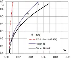 For the sake of practicty it does make sense to add more shedding if this seems to correlate better with results. In fact, scientists do this kind of things all the time when they don't have a solid evidence about something. Unfortunately, there is not enough data to know how the error is attributed to each of the two information sources (XFoil and Tucan's induced drag prediction algorithm). This could be done in the future with a CFD model. If the data extracted from the plot is correct, the laminar bubble predicted by XFoil seems to last too long, and maybe XFoil is thus also underpredicting the skin drag.