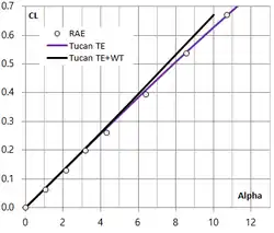 In the next table the lift coefficient prediction from Tucan for the wake being shed from the trailing edge only (no wing tips) are compared against the NACA experiment. The values from the experiment have been extracted using pixels from the graph with the given accuracy.