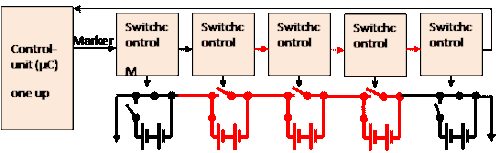 In idle state, all switches of all battery packs are tristate and thus safe. For starting operation, the control head shall put out a "marker" signal and 100ms an "idle" signal to wake up the battery pack. The switching cell next to the control head will store this "marker" information.