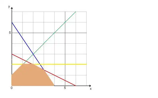 In this way all the inequalities can be shaded. The region which is shaded under all inequalities is the feasible region of the whole problem. Clearly in this region all the constraints of the problem hold. (The non negativity restrictions hold since we are working in the first quadrant.)