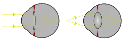To clearly see an object far away, the circularly arranged ciliary muscles will pull on the lens, flattening it. Without muscles pulling on it, the lens will spring back into a thicker, more convex, form. Humans gradually lose this flexibility with age, resulting in the inability to focus on nearby objects, which is known as presbyopia. There are other refraction errors arising from the shape of the cornea and lens, and from the length of the eyeball. These include myopia, hyperopia, and Astigmatism.