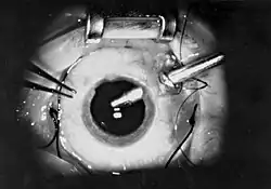 Intracapsular cataract extraction (ICCE) involves the removal of the lens and the surrounding lens capsule in one piece. The lens is then replaced with an artificial plastic lens (an intraocular lens implant) of appropriate power which remains permanently in the eye. The procedure has a relatively high rate of complications due to the large incision required and pressure placed on the vitreous body, thus is rarely performed in countries where operating microscopes and high-technology equipment are readily available[2]. Cryoextraction is a form of ICCE that freezes the lens with a cryogenic substance such as liquid nitrogen[4]. Although it is now used primarily for the removal of subluxated lenses, it was the favored form of cataract extraction from the late 1960s to the early 1980s[5].