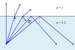 As the angle of incidence increases, the angle of refraction also increases. There comes a point in which the angle of refraction is 90° and means that the wave refracts parallel to the interface. This angle is called the critical angle and for angles greater than or equal to the critical angle, refraction does not take place and all of the light is reflected; this phenomenon is called total internal reflection and will be covered in the next section.