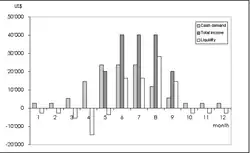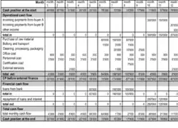 Figure 14 shows the liquidity situation of an organic vegetable production unit prior to getting external finance. They export during part of the year with weekly shipments. This means that the money comes back fairly regularly and the liquidity requirement is not high. Nevertheless, they need financing for their cash flow for the first 6 months.