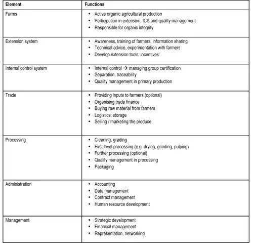 An organic business consists of several core elements that are interlinked with each other (Table 1). Obviously, first of all you need farmers from whom you will buy. Ideally, the farmers are not only producers but are also involved in post-harvest operations, in bringing the product together (bulking), and in ensuring the organic integrity and the quality of the production. Farmers need to be partners in your business - depending on the set-up of the business they can even be owners or shareholders of the business (see chapter "Involving farmers").