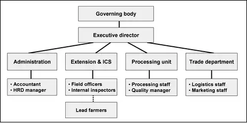 How you organise the different elements of your business depends on the size and scope of your operation - the smaller it is, the less organisational units you may require. However, even if one person is in charge of several functions, it is still advisable to have a clear idea of the different organisational units. Extension and ICS may be organised in one unit, and similarly processing and trade (unless processing is a major activity of your business). The organisational chart (Figure 11) provides an overview on how the key functions of the business are typically arranged.