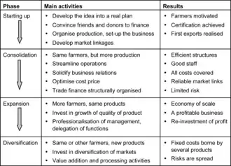 It is advisable to start small and fairly focused. Once you are able to handle a business on a small scale and if the market responds well, you can grow and/or diversify by adding components such as additional processing levels or other products. If you try to develop everything at the same time and on a large scale, you are very likely to fail. Growing rapidly because many farmers are eager to join can easily lead to a situation in which quality management and marketing are no longer ensured. Make a realistic plan for a period of 3 years to reach a first break-even point (it may actually become 4 or 5 years…). Only once you have reached this point, go for a next step of growth and diversification, which requires new investment. Most businesses go through phases of starting up, consolidation, expansion, and diversification (Table 2). This means that there is a continuous development.