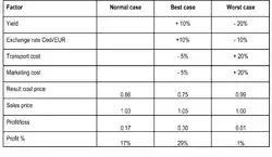 Cost calculations are normally based on real costs (existing business) or assumptions (start-up business). It is good also to analyse what happens when one or more of the factors changes considerably. This could be positive or negative changes. Typical changes are fluctuations in the currency exchange rate, but also higher or lower yields or changing market demand. A shortage of the crop may increase local prices above what you have planned to be the organic premium price. Increases in cost of diesel and energy have surprised many businesses in the recent past, so if you want to reduce your risks, you need to make a sensitivity analysis. This means that besides the normal case you calculate a best and worse case scenario. Table 5 provides an example of a sensitivity analysis. It is unlikely that all these factors will change for the better or the worse at the same time. You can also calculate worst and best case scenarios for each single factor.