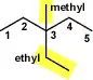 The main chain in the drawing is numbered 1-5. The main part of the branched substituent, an ethyl group, is numbered 1' and 2'. The methyl substituent off of the ethyl substituent is not numbered in the drawing.