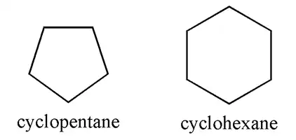 More often, cycloalkanes, like many other organic structures, are drawn such that their carbons and hydrogens aren't labeled. Cyclopentane and cyclohexane (see above) are generally drawn as a pentagon and a hexagon, respectively.