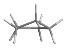 But angle strain isn't the only issue involved in ring strain. Torsional strain is also a factor. When the hydrogen bonds in a ring eclipse each other, this creates additional strain. In the case of cyclopropane the hydrogens eclipse each other, greatly adding to the strain. In fact, this is the cause of most of the strain found in cyclopentane. Cyclopentane has bond angles very close to 109.5°, but because 4 of its carbons are planar, there it has torsional strain that makes it less stable. Looking at the cyclopentane along 2 of the bonds on the plane, with the non-planar carbon closest to us, in the figure above, one can see that the bend in the bonds allows the hydrogens to move slightly out eclipse, reducing the torsional strain somewhat.