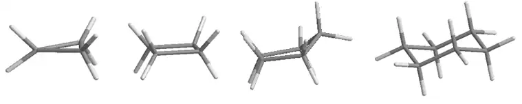 In the above figure, the first four simple cycloalkanes are again represented, but this time the 3 dimensional representations are shown. Notice how cyclopentane has 4 carbons on a plane and the 5th is slightly off the plane, giving it the shape of an open envelope.