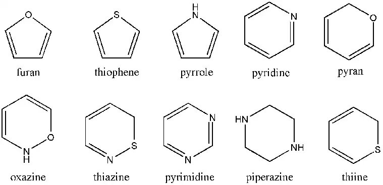 Heterocyclic compounds are cyclic compounds that contain atoms other than carbon in their ring. The figure above shows just a few single-ring heterocyclic compounds. The ones shown are simply 5 and 6 membered rings. There are smaller and larger rings and there are also multiple ring heterocycles.