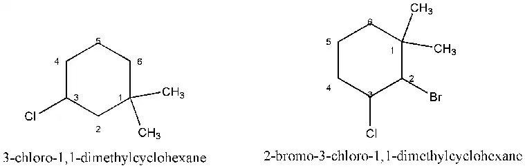 Numbering of carbons in substituted cycloalkanes is fairly straight-forward. If there is only one substituent, it is the 1-carbon. If there are more than one, then numbering proceeds, clockwise or counter-clockwise, such that the lowest number after 1 goes to the least (or a least) substituted carbon. I know that sounds tricky, so we'll look at the example on the left, 3-chloro-1,1-dimethylcyclohexane. the carbon with the chlorine bond is the least substituted carbon, so it gets the lowest number after 1 and 1 goes to the nearest carbon with more than 1 substituent. So, the 1 is applied to the methyls. Substituents are still placed in alphabetic order, as you can see from the second example, 2-bromo-3-chloro-1,1-dimethylcyclohexane.