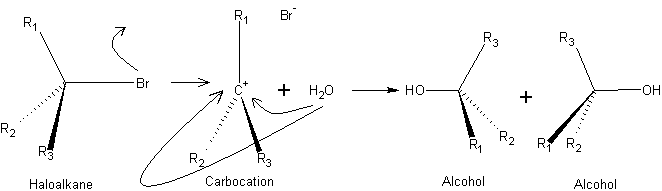 SN1 - Product is a mixture of inversion and retention of orientation because the carbocation can be attacked from either side. In theory the products formed are usually racemic due to the 50% chance of attack from the planar conformation. Interestingly, the amount of the inverted product is often up to 20% greater than the amount of product with the original orientation. Saul Winstein has proposed that this discrepancy occurs through the leaving group forming an ion pair with the substrate, which temporarily shields the carbocation from attack on the side with the leaving group.