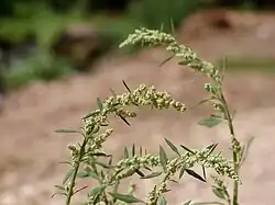 Pulling and grubbing is relatively easy, since the root and shoot are strongly connected. This plant is safe to compost in cold piles before the flowers appear in summer. Flowers are greenish terminal spikes. While rarely seen in Mid-atlantic gardens, the culinary grain Quinoa (C. quinoa) is almost indistinguishable from the weed species, so maintenance crews should always be advised if that species is being grown in the garden. Epazote, or Wormseed (Dysphania ambrosioides) is somewhat similar when in flower, but the foliage is markedly different from Lamb's Quarters. |