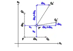 Looking at Figure 2, there is a point infinitesimally close to , called , with coordinates . When is displaced to by the deformation, is similarly displaced to with coordinates . Thinking critically, the displacement experienced on a body depends on the position on the body. Therefore . This allows us to use the chain rule to express infinitesimal displacements. Now define the following terms: