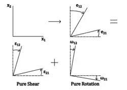 Here, is the strain tensor and is the rotation tensor. This can be seen schematically in Figure 4. In the scope of this text, we are only interested in , but it is generally still worth remembering that displacement includes both shear and rotation components: