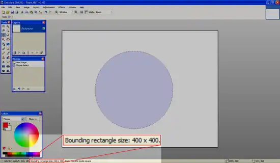 Use the Ellipse Select tool and (holding the SHIFT key) drag a circle that has a Bounding Rectangle size of 400 x 400 pixels.