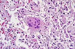 Riesenzelle mit intrazytoplasmischen inclusion bodies bei Masernpneumonie, Histopathologie.