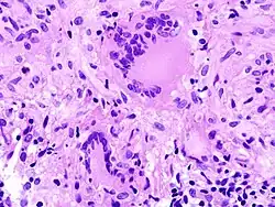 • Fremdkörper-Riesenzellen - Typisch in Fremdkörpergranulomen, die Zellkerne sind in einem Haufen zusammengelagert