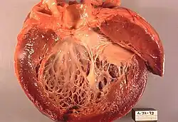 Kardiomyopathie mit globoider Dilatation des linken Ventrikels, Wandverdickung und Endokardfibrose, Autopsiepräparat.