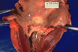 Mitralstenose mit verdickten Klappen, Autopsiepräparat.