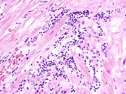 Mikro: Interstitielles lymphozytäres Infiltrat (kleine blaue Zellen), kaum Nekrosen.