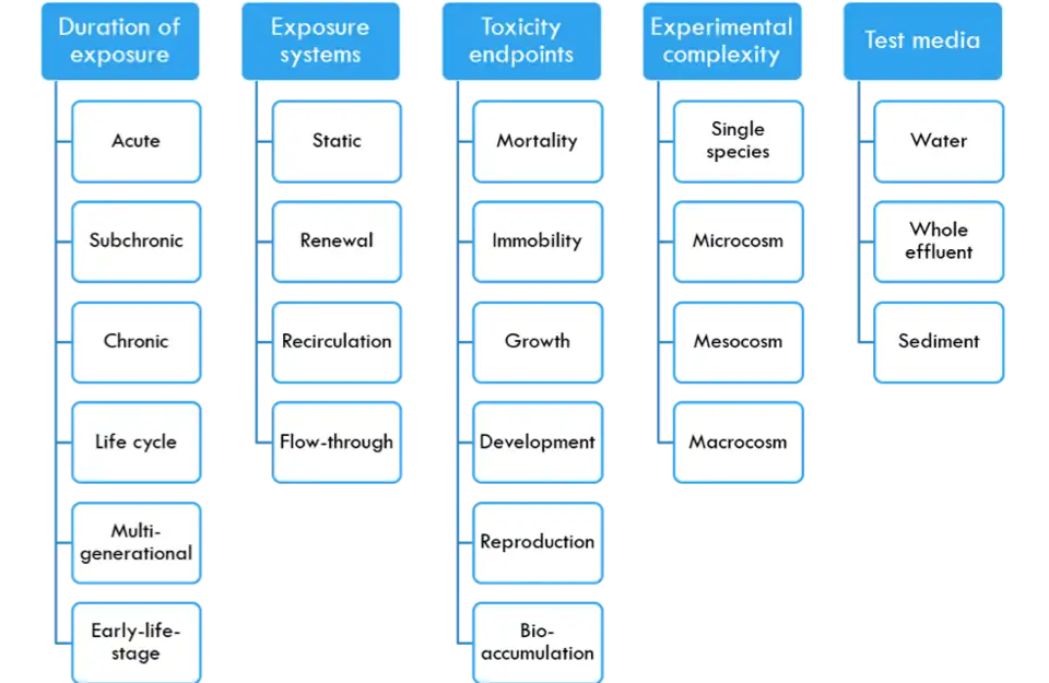 Aquatic toxicity tests can be divided into categories as described below and summarized in Figure 6.