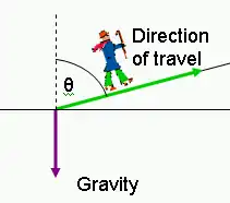 In a situation like this we can still work out the work done. In the diagram, the green lines represent the displacement. To find out how much work against gravity the man does, we work out the projection of the displacement along the line of action of the force of gravity. In this case it's just the y component of the man's displacement. This is where the cos θ comes in. θ is merely the angle between the velocity vector and the force vector.