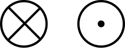 Answer: Vectors in the plane of the page are drawn as arrows on the page. A vector that goes into the plane of the screen is typically drawn as circles with an inscribed X. A vector that comes out of the plane of the screen is typically drawn as circles with dots at their centers. The X is meant to represent the fletching on the back of an arrow or dart while the dot is meant to represent the tip of the arrow.
