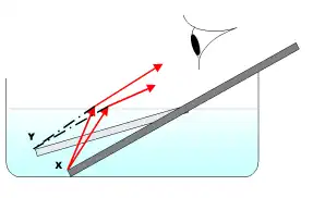 In the diagram, the dark rectangle represents the actual position of a pencil sitting in a bowl of water. The light rectangle represents the apparent position of the pencil. Notice that the end (X) looks like it is at (Y), a position that is considerably shallower than (X).