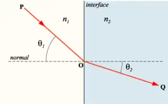 The ray continues through the interface into the medium on the right; this is shown as the ray OQ. The angle with which is makes to the normal is known of as the angle of refraction, θ2.