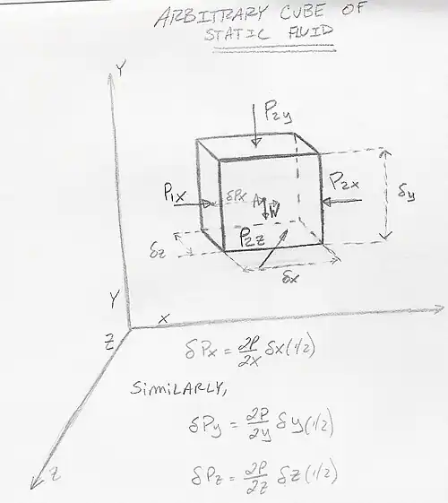 Thus, we have six pressures: , and (only some are shown in the figure). Each of these pressures act upon a face of the cube. Of course, the depth of this cube is arbitrary, so we must redefine each of these pressures to some arbitrary pressure at the center of the cube, which we will label .