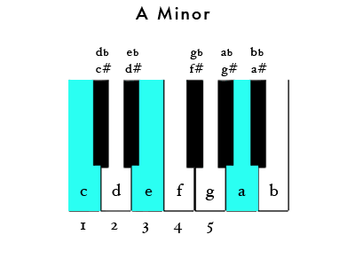- next, we just move our root up, from g to a, getting an a minor chord in natural state (left hand: a5, c3, e1; right hand: a1, c3, e5)