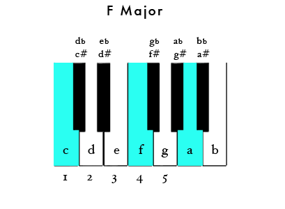 [Notice that the chord is composed of three notes, C, F, and A. While this is still a F Chord, it is not in it's "natural" state. C Major, is composed of C, E, and G and has a normal, 5, 3, 1 left hand finger pattern. This chord is in its "natural" state, the state of not being inverted. This means that we take the degrees or 1st, 3rd and 5th notes of the scale to compose the chord. Whenever a chord follows the pattern that C Major does, it is a regular chord. F Major, which follows a different pattern, is called an inverted chord (second inversion). Every chord has 3 different patterns. The regular pattern, which looks like the C Major chord above. 1st Inversion (not shown) means that the first note of the chord, (for example, let's use the C Major chord, in which the first note is C) goes to the top of the pattern (So you play, with finger 5, E, finger 3, G, and finger 1, C.) Second inversion, which looks like F or G Major, involves putting the next note (still using the C chord, E in this case) on top of your fingering pattern (played finger 5, G, finger 2, C and finger 1, E). Using inversions helps you to play chords quicker without having to constantly move your hand. Take note, though, that different inversion produce different sounds, so pick the one that is best for your situation.]