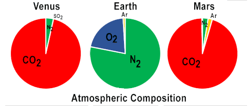 Atmospheric composition of Mars, Earth and Venus, with carbon dioxide rich atmospheres on Mars and Venus, and a Nitrogen/Oxygen rich atmosphere on Earth.