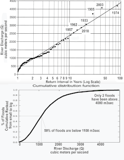 Real time measurements of a river’s discharge (Q) are recorded at gauge stations along the course of the river in cubic meters per second (m3/s) or cubic feet per second (ft3/s), by measuring the width, depth and velocity of the river’s flow. This data is sorted by peak discharge and the date of that peak discharge. Each date’s discharge is numerically ranked from the greatest discharge to the smallest discharge. The return period for each discharge is calculated by the inverse probability that the flood will be exceeded on that given date of a given rank. If the return period is 0.01 (1:100) for a given year, then the reoccurrence of a flow of this discharge will be 100-years. This method of analysis is named the Gumbel distribution; named after Gumbel who developed the mathematics in 1935, and later applied it in the study of floods in 1941. Gumbel’s statistical analysis focuses on the probabilities of extreme events, from catastrophic floods to the rise of authoritarian regimes. Today, Gumbel’s studies of extreme events are important in understanding the effects of climate change on Earth, particularly how changes in the atmosphere might affect the flow of rivers across Earth’s surface.