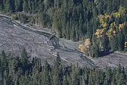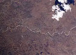 Throughout their history rivers on Earth have moved enormous amounts of sediment from the continents and toward the oceans, through a process of denudation. Denudation are the processes that cause the wearing away of the Earth’s surface by moving water. These sediments accumulate in drainage basins and along coastlines of continents, where they are deposited. Rivers tend to move sediments also horizontally across a drainage basin as they cut into one side of the river bank, and redeposit sediments on the opposite side on the point bar, but slightly more downstream. This deposition of sediments results in cross-bedding which is tilted downward toward the channel axis. Geologists can measure these cross-bedding features to determine the changing directions of flow of river systems over time. Rivers also cut down through the landscape, leaving terrace deposits of coarse river pebbles at different elevations during this process of eroding deeper into a canyon. These terrace deposits, if dated, can yield a history of canyon or valley incision for the river system.