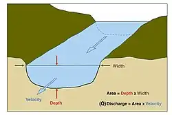 One of the most important measurements of a river’s flow is Discharge (Q). Discharge is the total amount of water passing through a point along the river at a specific interval of time. To measure discharge, the rivers velocity, width and depth must be known. Q = V x W x D. Discharge in rivers is measured by a river gauge station. A gauge station is a concrete lined section of river that restricts the flow of the river within a specific width. Depth is measured using a ruler scale on the side of the flowing river, and velocity using a flow meter. Discharge is often monitored on various sections of rivers that are prone to spring flooding, as when discharge rises quickly following a storm, flood warnings can be issued to people living down river. The average discharge of rivers will increase with their increasing order, as more water enters from the surrounding tributaries that drain into the main river channel. The Mississippi River has an average discharge around 200,000 to 700,000 cubic feet per second entering the Atlantic Ocean. The Colorado River during the time of Powell’s trip had an average discharge around 22,500 cubic feet per second entering the Pacific Ocean, today almost no water from the Colorado River reaches the Pacific Ocean, as most water is lost due to its evaporation and use upstream, held back by the many dams along the river. In a natural state, rivers will increase the amount of discharge downstream, with the largest amount of water flowing into the oceans, forming river deltas or estuaries.