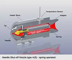 There are some nozzle designs that incorporate shutoff devices in the form of needles, springs, sliding balls, or combinations of these. The picture on the right shows needle type nozzles. Their purpose is shut off the flow of plastic for those materials that are not highly viscous, such as nylon, and that tend to drool from standard nozzles.
