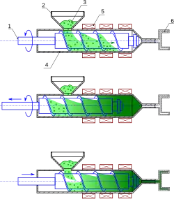 Today, the more common technique is the use of a reciprocating screw. A reciprocating screw moves the material forward by both rotating and sliding axially, being powered by either a hydraulic or electric motor. The material enters the grooves of the screw from the hopper and is advanced towards the mold as the screw rotates. While it is advanced, the material is melted by pressure, friction, and additional heaters that surround the reciprocating screw.