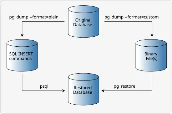 The following diagram visualizes the cooperation of pg_dump, psql and pg_restore.