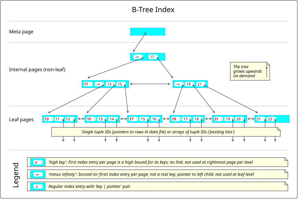 - The first index entry of every page contains a value, which is treated as an upper bound for all keys of this page. It does not contain a pointer to another page. It is called the high key, and in the above graphic, it is shown in red color. The rightmost page of every level doesn't contain a high key. It's plus infinity per definition.