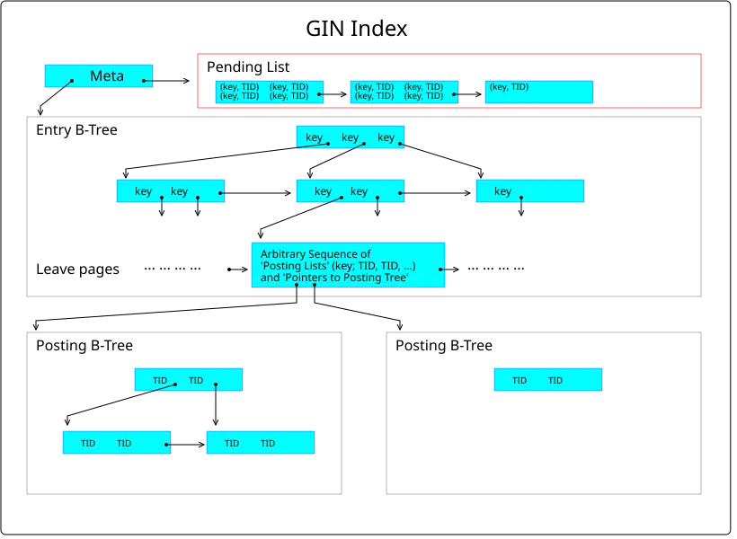 GIN indices use two special optimizations. First, if the value of different components (possibly in different rows) is used often, the set of TIDs is rearranged to a B-Tree within the GIN. Consider the case of many text documents: Many words will likely be repeatedly used in the same and in different documents. In this case, the list of TIDs may grow to the thousands, and a tree is better suited to manage them than a list.