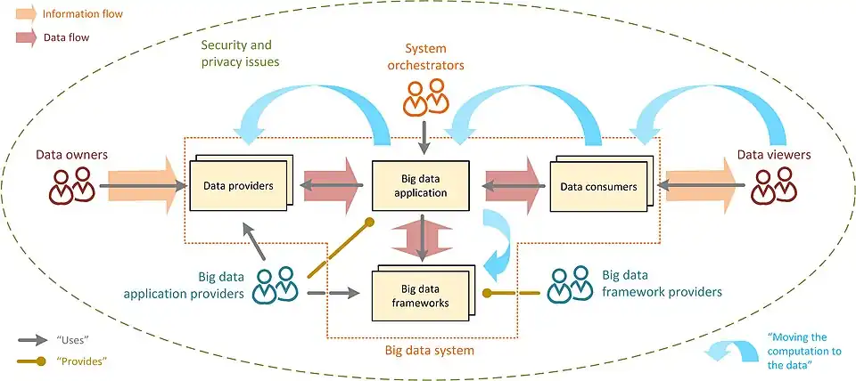 Database management systems match this definition. Data providers have many methods at their disposal to transmit data: event subscription and event notification, application programming interface, file compression, Internet download, and so on. They can equally decide to create a query language or another mechanism to let users import processing without fetching data. This practice is described as moving the computation to the data rather than the data to the computation[3], and is represented in the above depicted figure by directed arcs. A data provider may turn information entered or taken from data owners into digital data that can be processed by computers. In that case, it is a boundary between the big data system and the non-digital world. This is, for instance, the function of a dialog box or an online form. All capture devices such as video cameras and sensors are data providers too.
