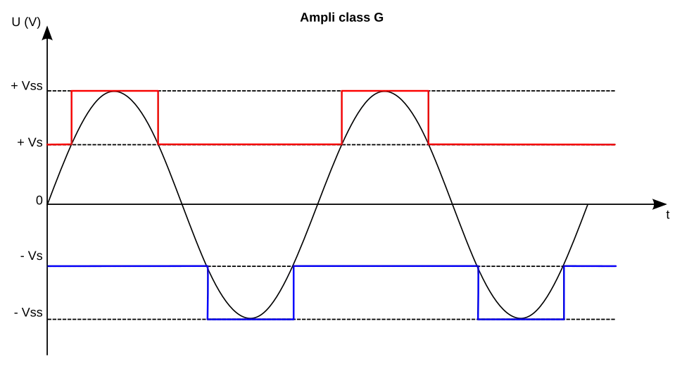 Class G amplifiers (which use "rail switching" to decrease power consumption and increase efficiency) are a more efficient than class AB amplifiers. The class G amplifier has several power rails at different voltages, and switches between rails as the signal output approaches each. Thus the amplifier increases efficiency by reducing the wasted power at the output transistors.